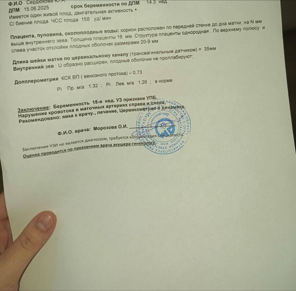 Результаты: УЗИ, КТГ, доплера, скринингаВсем привет, сейчас была на узи, были жалобы на боли в животе, сказали есть небольшая отслойка, потом врач сказала что кровотоки в норме, но в заключении написала что есть нарушение маточных кровотоков слева и справа,беременность 14 недель, у кого-то так было?