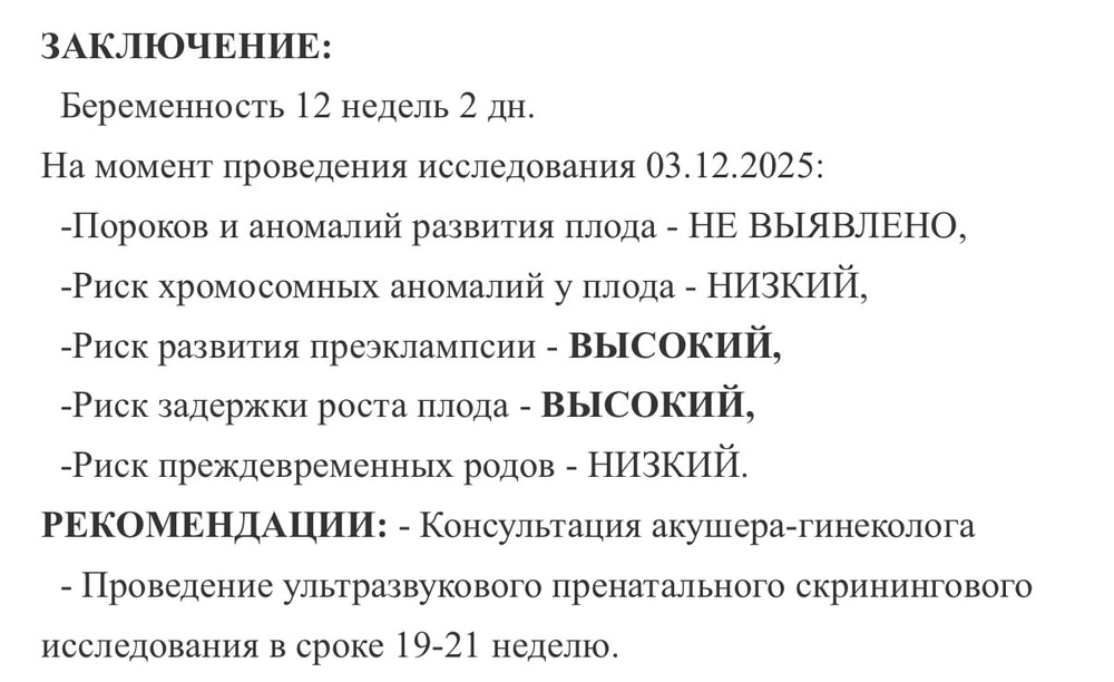 Так у вас все хорошо… низкий риск на пороки развития, все отлично… про прекламсию и задержку развития забейте вообще, особенно если нет проблем с давлением и кровью. Этот риск вроде бы высчитывается из анамнеза, когда документы заполняешь, а не по показателям крови. Просто для вас маячок следить лучше за собой. У скольких людей прекламсия выстреливает при низких рисках и наоборот… так что не беспокойтесь, все у вас хорошо) скоре всего назначат кардио магнил и еще там что-то назначают профилактически
