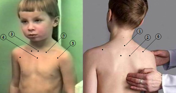 На первом этапе делается массаж асимметричных зон грудной клетки, потому что у детей с гиподинамией и отклонениями в формировании скелета имеется фрагментарная деформация грудной клетки с наличием зон умеренной кожно-мышечной гипертрофии. Эти зоны асимметричны и расположены диагонально.