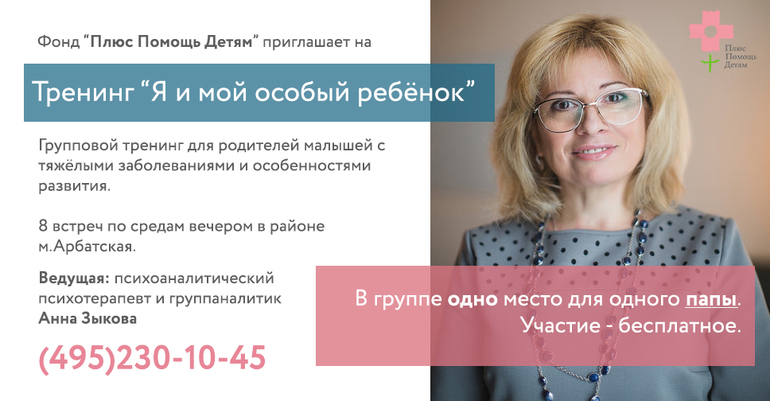 Длительность тренинга «Я и мой особый ребёнок» - 8 встреч по 90 минут один раз в неделю. В районе метро Арбатская. Ведущая тренинга: психоаналитический психотерапевт и группаналитик Анна Зыкова. У нас осталось одно место в группе для ОДНОГО папы.