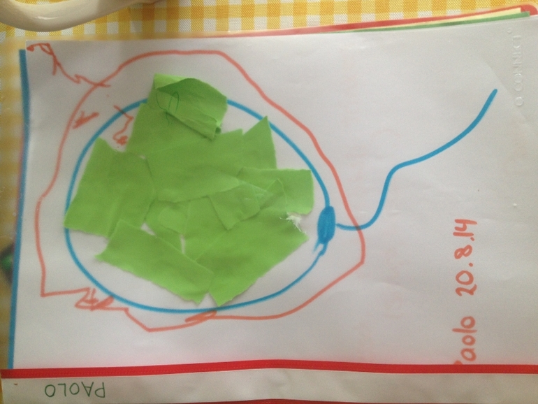 Сегодня было второе занятие. Что делали в деталях час - не знаю, но вот фото того, что они делали с помощью клея и трубочки для коктейля. Задание- трубочкой подцепить (на вдохе) бумажку, и удерживая ее так, положить в контур шарика.