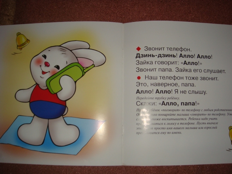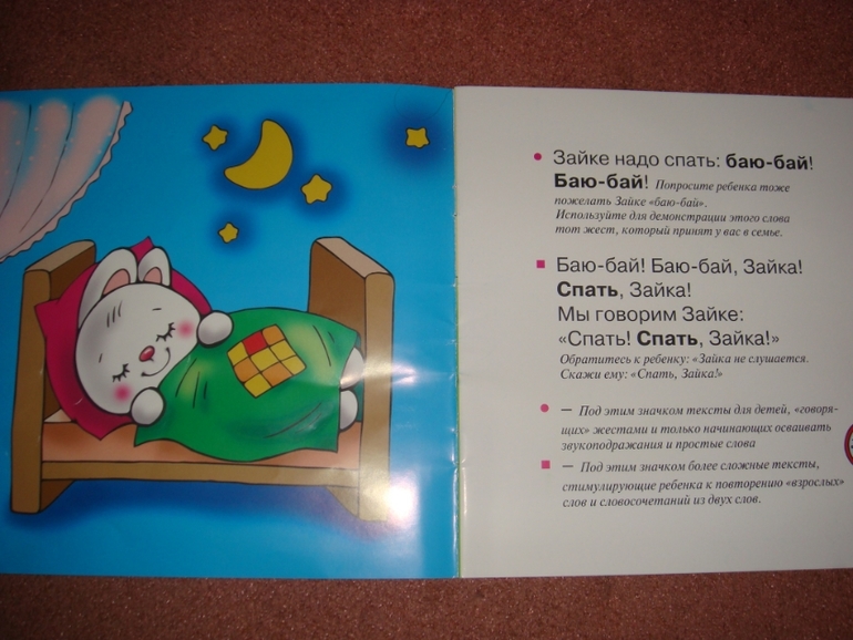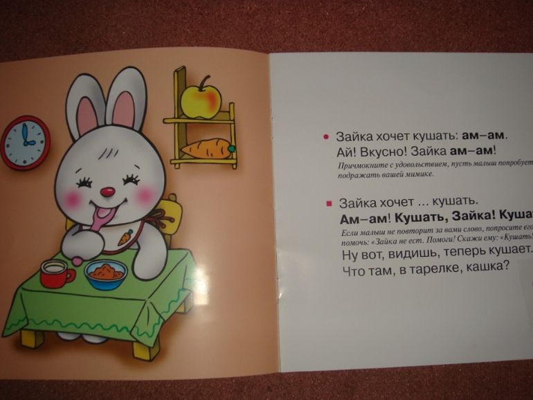 В книгах этой серии уже присутствует больше информции. Например в рамке самый простой вариант, которы сразу предлагается малышу для повторения. НАД картинкой текст для чтения ребенку от 1,5 лет. А ПОД картинкой текст для чтения ребенку с года и выделены слова которые ребенку предлагается повторить. А также в углу предлагается задание для физической активности (Покажи как зайка шевелит ушами).