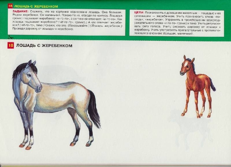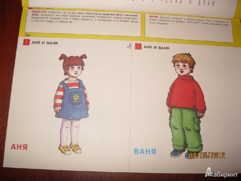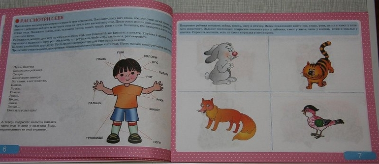 Иллюстрации хорошие, крупные. В первом разделе дети вместе с главными героями книги: Аней и Ваней выполняют движения в соответствии со словами стихотворения. Стихи достаточно простые и запоминающиеся,Во вором разделе ребенок знакомится с домашними и дикими животными. По совету авторов, после каждого занятия отрезать лист и вставлять его в файл, таким образом перенести книгу в папку с файлами. Так станет удобнее работать с книгой, а также можно еще к тому же проводить дорожки от мамы к детенышу прям сверху по файлу.