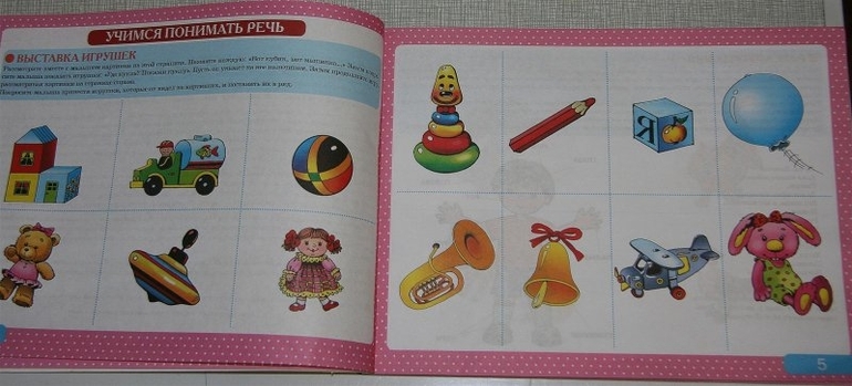 1. Учимся понимать речь. Сначала показываем игрушки на картинках, а затем приносим их. Далее, в этом же задании - учим слова действия = что делает Нина? Играет, катается, сидит, качается...