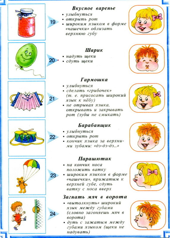 - Сначала упражнения надо выполнять медленно, перед зеркалом, так как ребенку необходим зрительный контроль. После того как малыш немного освоится, зеркало можно убрать. Полезно задавать ребёнку наводящие вопросы. Например: что делают губы? что делает язычок? где он находится (вверху или внизу)?