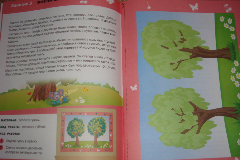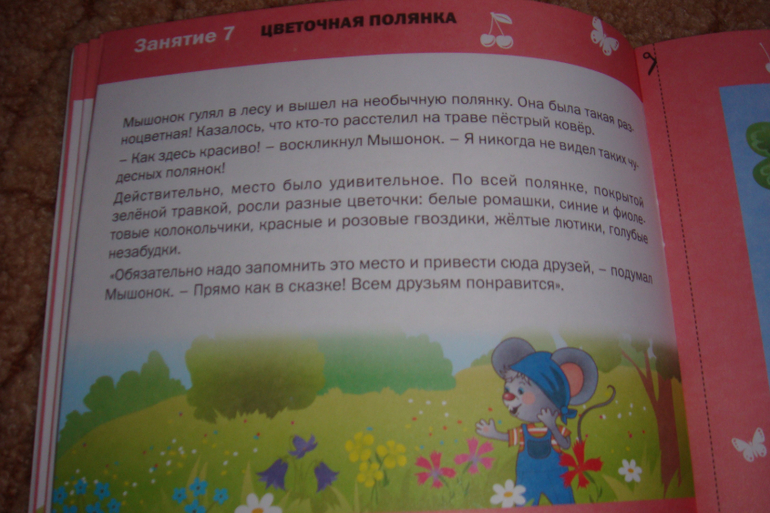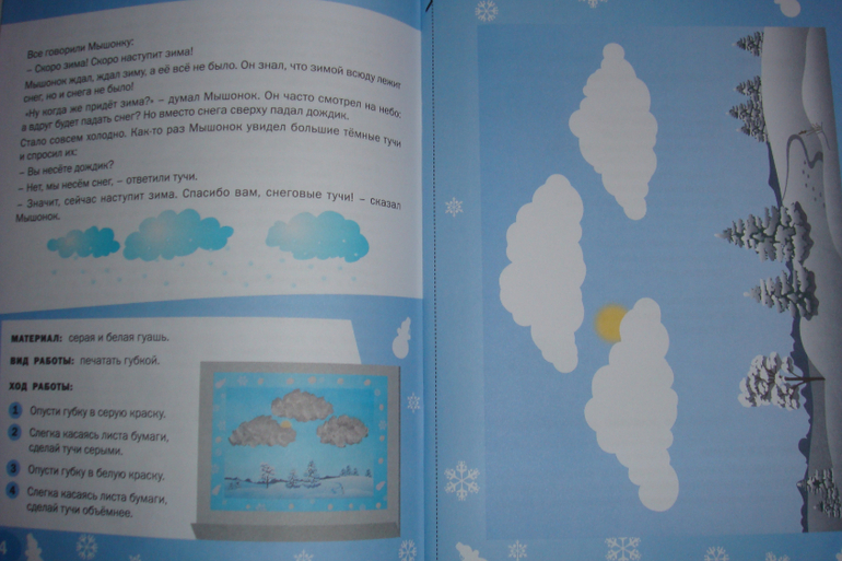 Открываем книжку и НИЧЕГО больше не надо придумывать. Здесь есть все для занятия с малышом. Например, задание № 1 по книжке ЛЕТО. Сначала идет маленький рассказ про мышонка, который увидел в небе тучки. Буквально на пол странички. Далее написано какие нужны материалы, и что сделать. Лист с заданием прилагается. На нем и выполняем задание. А затем даны 4 подвижных игры. На физическую активность, пальчиковая гимнастика. Вот и все. Весело и интересно. Рекомендую.