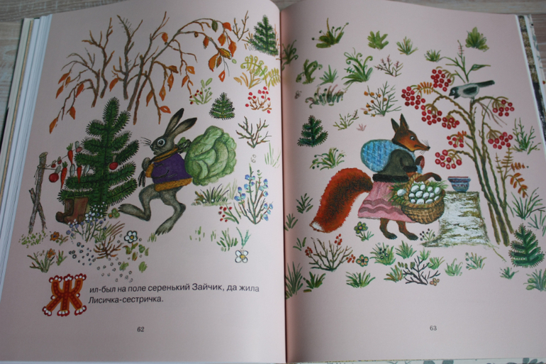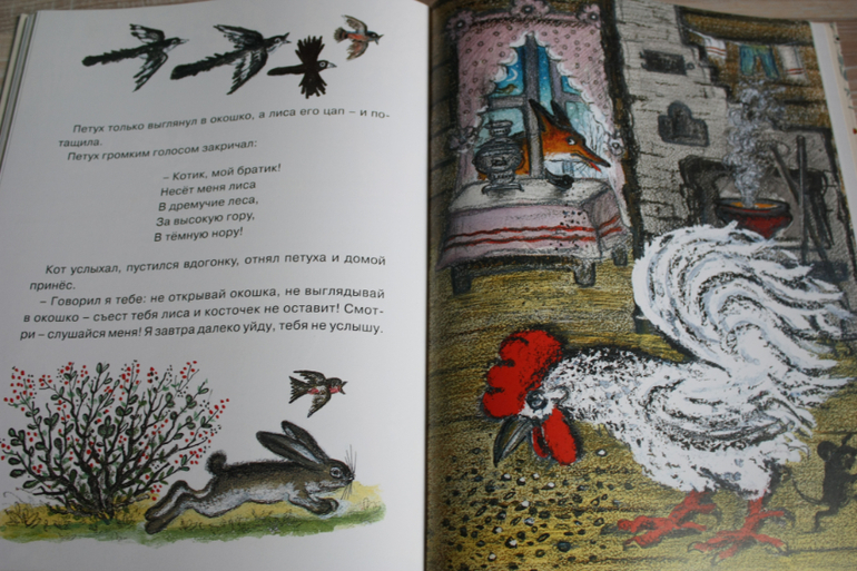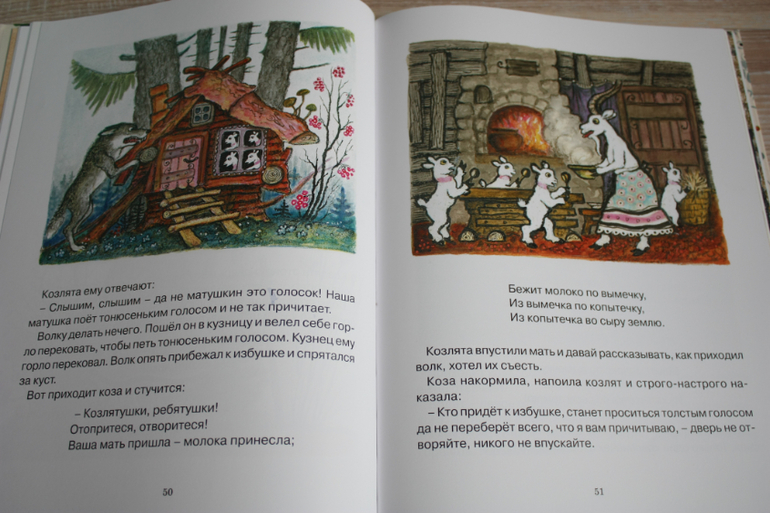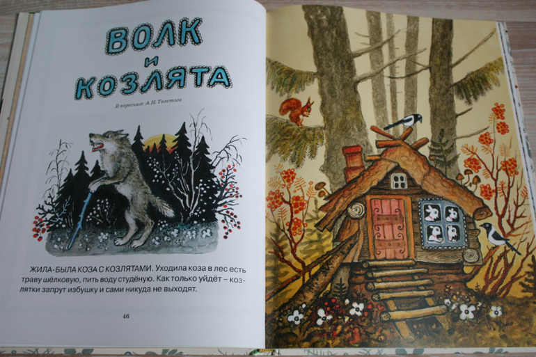 Сборник с иллюстрациями Васнецова потешек и русских народных сказок. Сын оценил иллюстрации,а мне нравится,что сказки в классическом длинном варианте ,без упрощений и сокращений,поэтому сказки получаются длинные. Советую покупать такую книгу сразу , вместо дурацких " Проф-прессовских" вариантов с глазками и дикими картинками и урезанными текстами. Не отрицаю, у нас тоже такие были. Помнится нам кто-то придарил " Волк и семеро козлят", где волк изображен натуральным тюремником, только вышедшим из заточения. В книге собраны несложные сказки о животных для детей до 3х лет: " Колобок","Репка", "Волк и козлята", " Лиса и заяц", " Кот Котофеевич"," Кот, Петух и Лиса", "Три медведя".