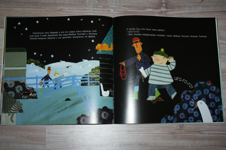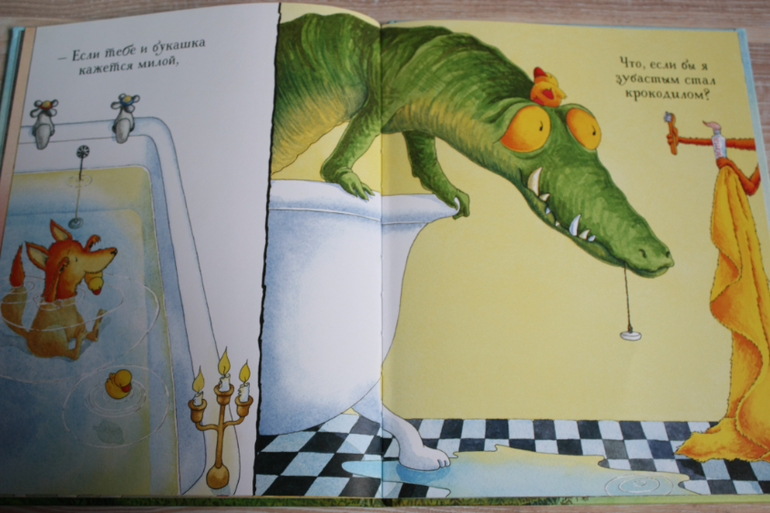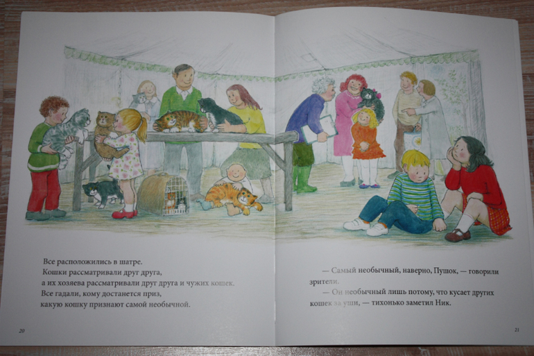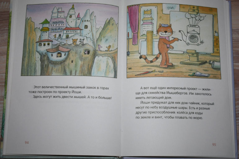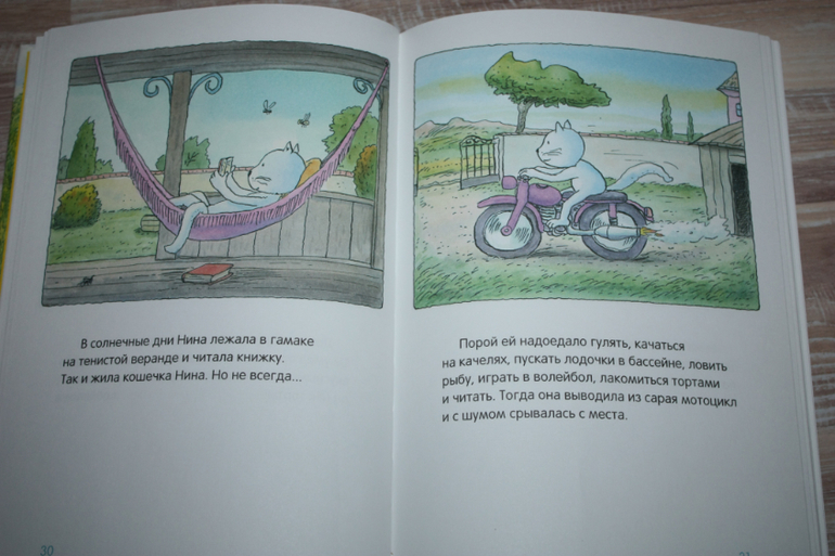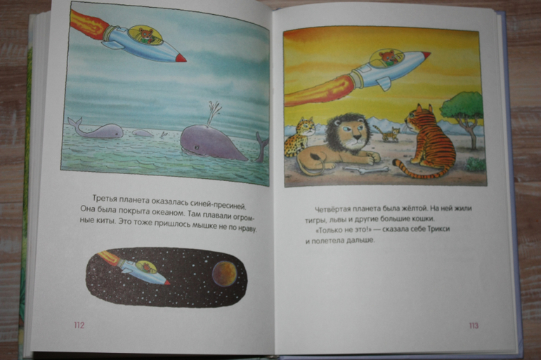 Хорошая по содержанию книжка,но издание не безупречное на мой взгляд при недешевой цене. Картинки на полстраницы,текст под картинкой.Текста мало,остаются полупустые страницы снизу.Но сын очень любит ее. Это сборник рассказов о приключениях разных животных,как бы очеловеченных. Но истории креативные такие. При этом о дружбе, взаимопомощи. То кошка гоняет на мотоцикле и прыгает с парашютом,когда ей наскучивает обыденная жизнь, то мышке надоела жизнь в городе,потому что возле ее дома образовалась свалка мусора,и она решила улететь на другую планету. Непонятой осталась история вторая по содержанию о лягушонке, который хотел, чтобы его поцеловали. Мы ее никогда не читаем)