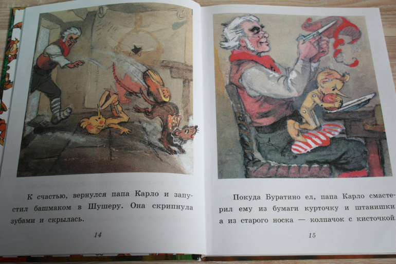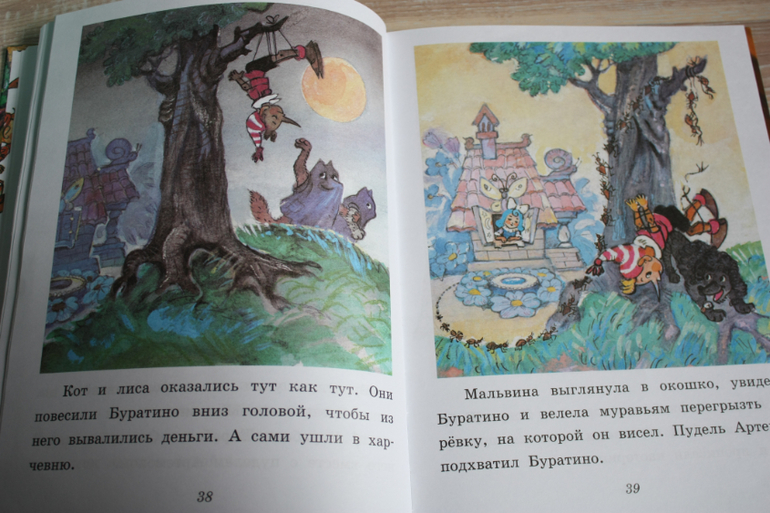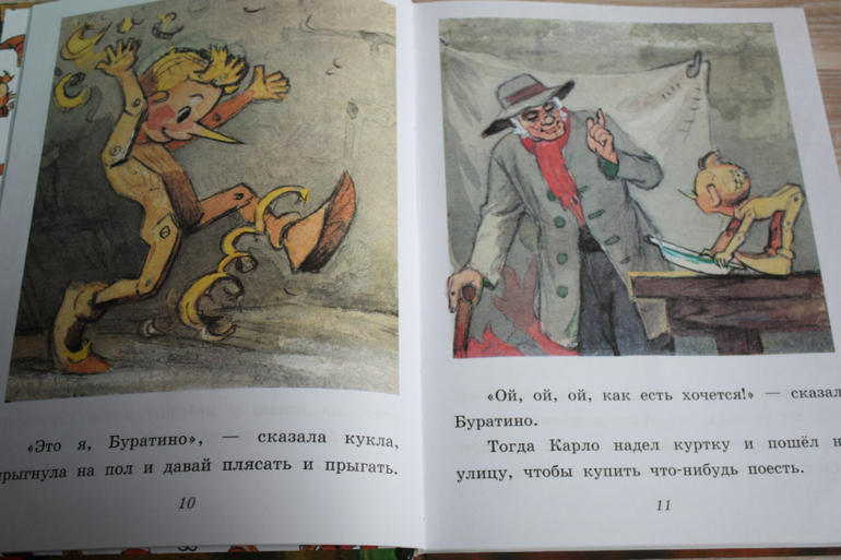 Это адаптация для малышей А. Толстого,текста мало.Рисунки как из моего детства,блеклые. Историю Буратино пересказывать не стоит ? ) Адаптация очень простая, буквально по 2 коротких предложения на лист. Можно сказать, альбом с картинками, только и успевай страницы перелистывать. В то же время, уверенность малышу внушает, как хорошо он слушает, такую большую книжку за раз прочесть.