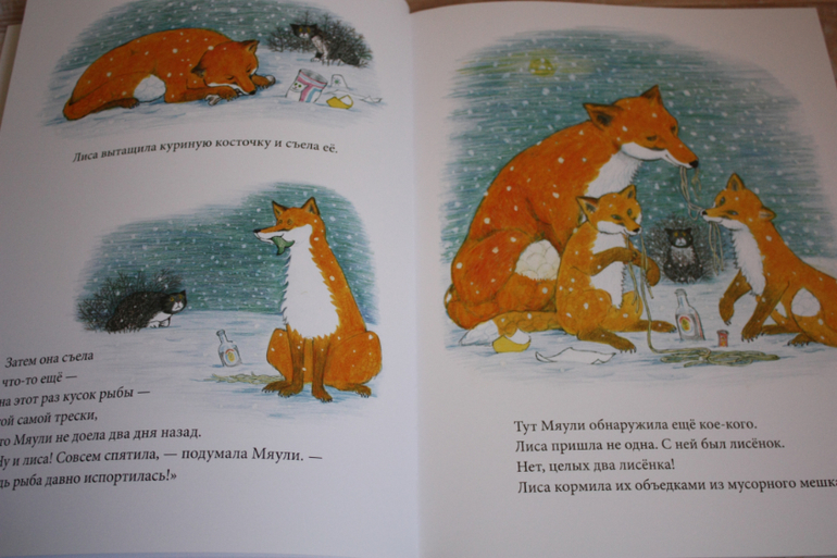 Эта история о том,что Мяули не захотелось есть на ужин предложенную рыбу,а хотелось сьесть яйцо,но хозяин разозлился и сказал,что она останется голодной и утром,если сейчас не сьест рыбу. Знакомая ситуации в кормлении ребенка,надо сказать. В противоположность кошке приводяться лисы,которые не только из мусорки поели с удовольствием,а еще залезли в дом и сьели рыбу для Мяули. Кошка забеспокоилась,но это пошло ей на лапу,хозяин подумал,что это сьела она,и похвалил)