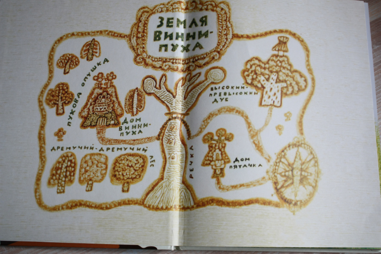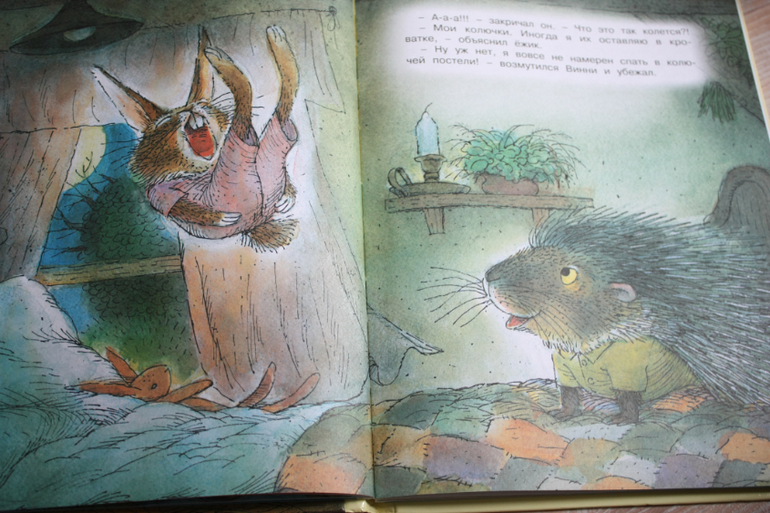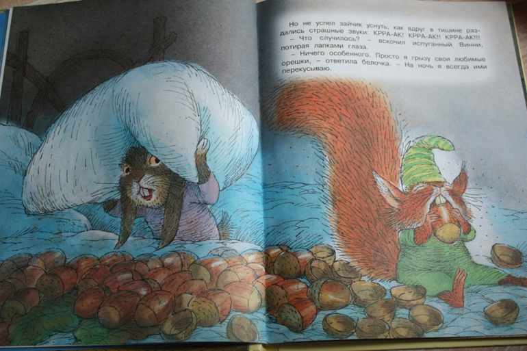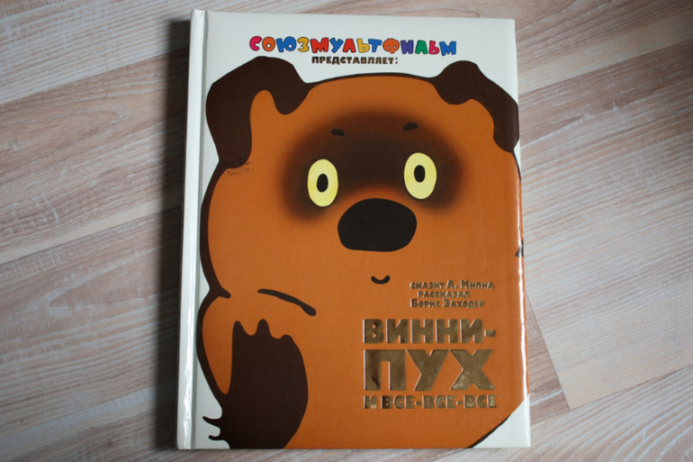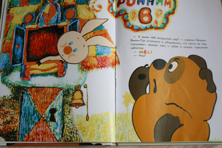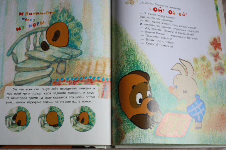 Книга по мультику,картинки-точные кадры.Любовь к Винни пуху у нас началась до 2х лет,так что мы даже день рождения отмечали с тортиком с Винни пухом. Я тянула долго с покупкой этой книги,цена кусалась,но не жалею ни капли. Сейчас мы и песенки поем по ней и разыгрываем сюжеты с игрушками пластизоль. Состоит из трех глав: о том, как пух залез в улей, застрял в кроличьей норе и про день рожденье ослика.