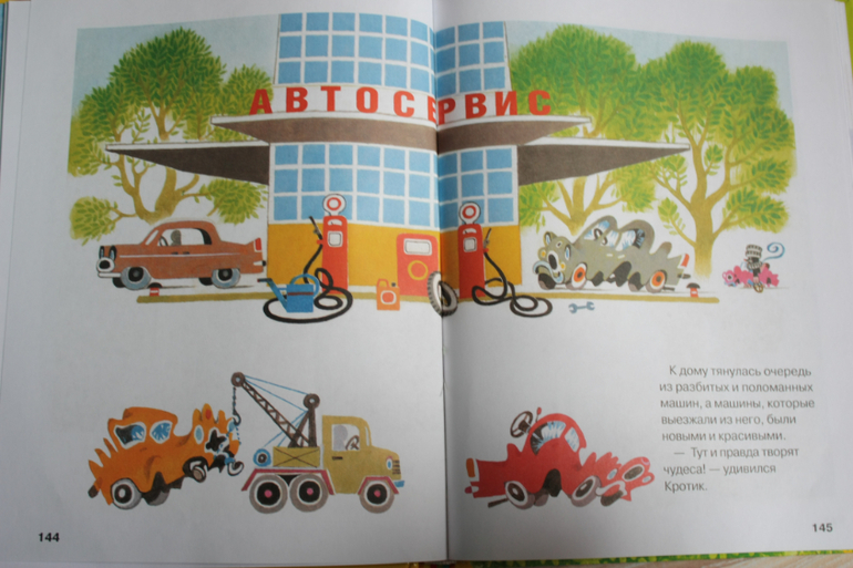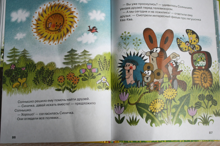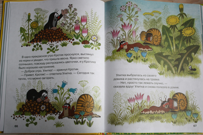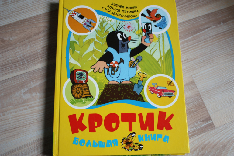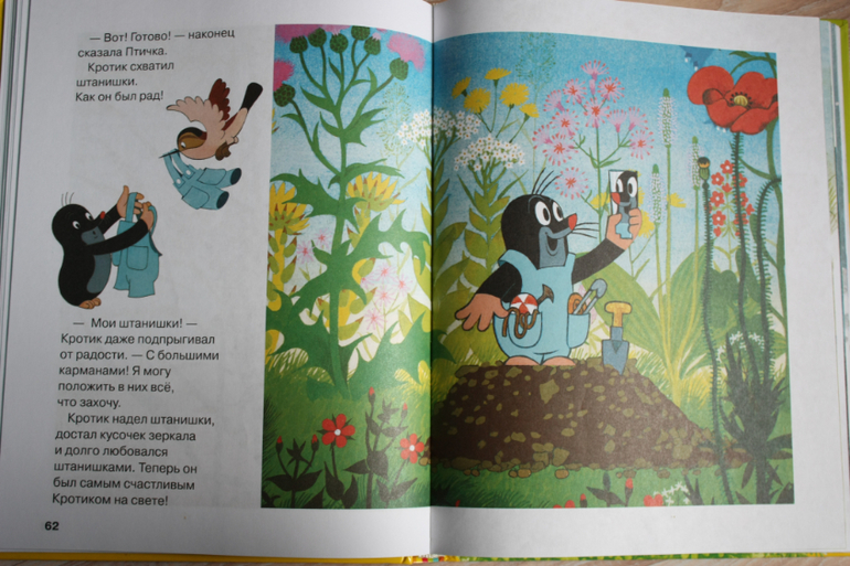 Кротика любила в детстве и очень рада,что сын им тоже увлечен. Добрые поучительные истории. Книга годится для малышей,потому как вся страница в картинке,текста мало и описание очень подробное простым языком. Поэтому выходит,что в большой книге всего 4 рассказа.Про путешествие на ракете,как кротику помогает краб вернутся домой и спастись от шторма на берегу моря;про штанишки,где объясняется как получается ткань;про телевизор и как вредно его много смотреть;про автомобиль,его техническое устройство. Претендует на своего рода энциклопедию, потому что описываются такие сложные вещи, как сборка автомобиля и ткание полотна из льна, совсем простым языком.