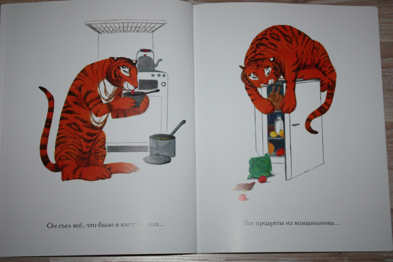 Не знаю,чем именно книга понравилась сыну. Во-первых,героиня-девочка,но он видимо все равно ребенка на себя проецирует,во-вторых,особенно закрученного сюжета нет:ну,приходил тигр,все съел, все что предложили мама с девочкой, и даже больше, все что стояло на столе, потом в шкафах и в холодильнике, потом все выпил, даже воду из крана, что даже купаться было нечем. А вечером голодного папу нечем было кормить, но папа молодец, повел семью на ужин в кафе. А для тигра купили на всякий случай тигриные консервы, но он больше не приходил.