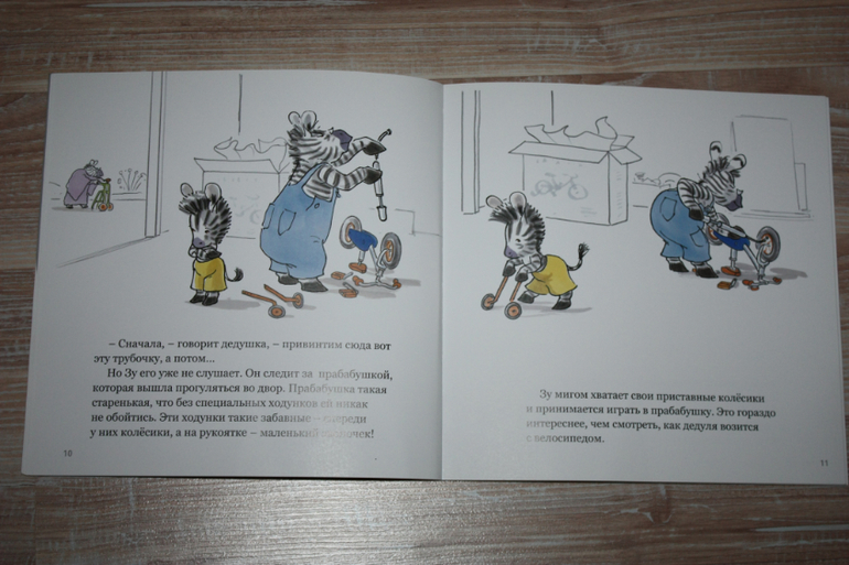Про Зу сначала мультик полюбился,увидела книгу и решила взять.Простейшая история из жизни любого ребенка,которого зацеловывает бабуля, что приходится вытираться, и хочется велосипед, да не просто, а чтоб выглядел как взрослый, без страховочных колес. Подобие беговела надо сказать описывается, на котором Зу резво без педалей носится от родственников.