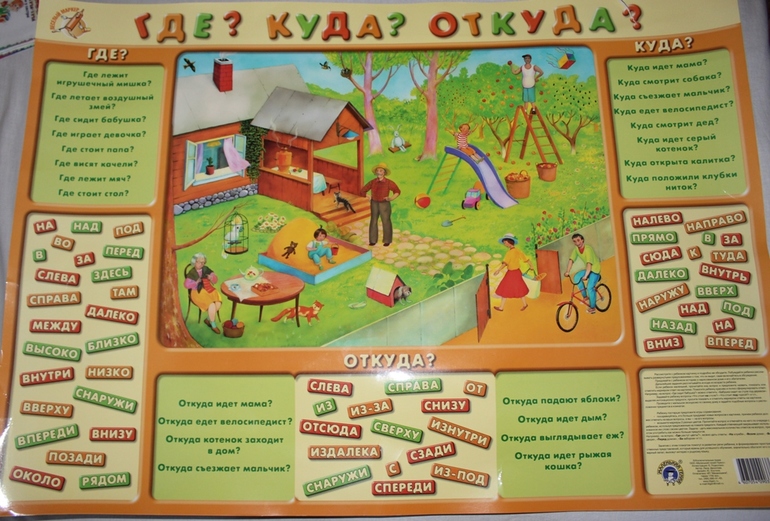 2) Плакат Лены Даниловой "Где? Куда? Откуда?". Задавая вопросы по картинке, стимулируем ребенка произносить слова (вопросы, кстати, на нем же написаны). Попутно запоминаем предлоги и учимся правильно склонять слова.