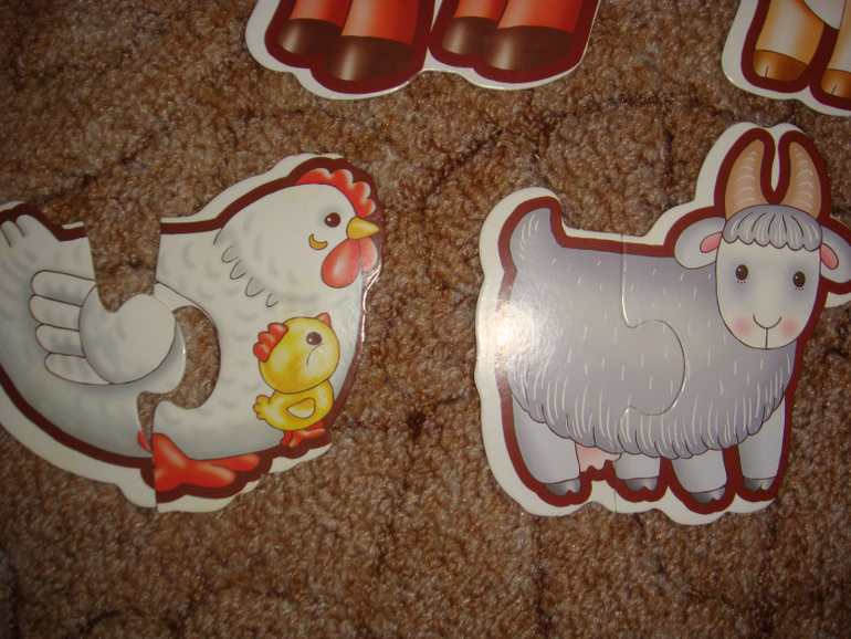 Очень удачные пазлы для самых маленьких. Крупные, симпатичные картинки. Картон очень плотный, белый. Картинка состоит из 2 частей.. Размер, например коровы 13см на 14см. Всего 16 деталей и 8 очень симпатичных,ярких фигурок животных.![]()