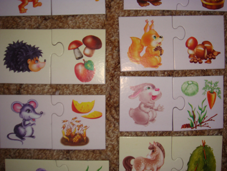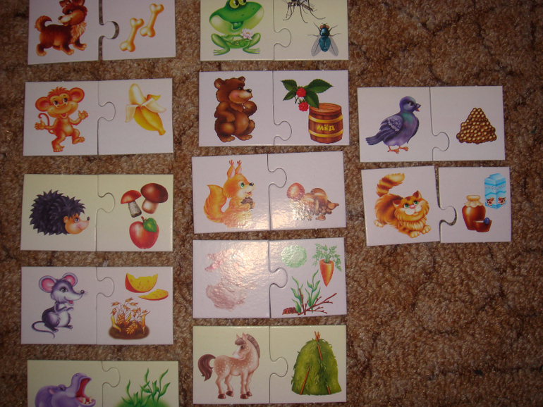 Игра стоит копейки, а сколько обучающего. Тут и пазлы и изучение животных и их предпочтения в еде. Картон очень плотный. Пазловые замочки у каждой паре на разной высоте, так что не правильно собрать не получится. Размер карточки 5 см. на 5 см.![]()