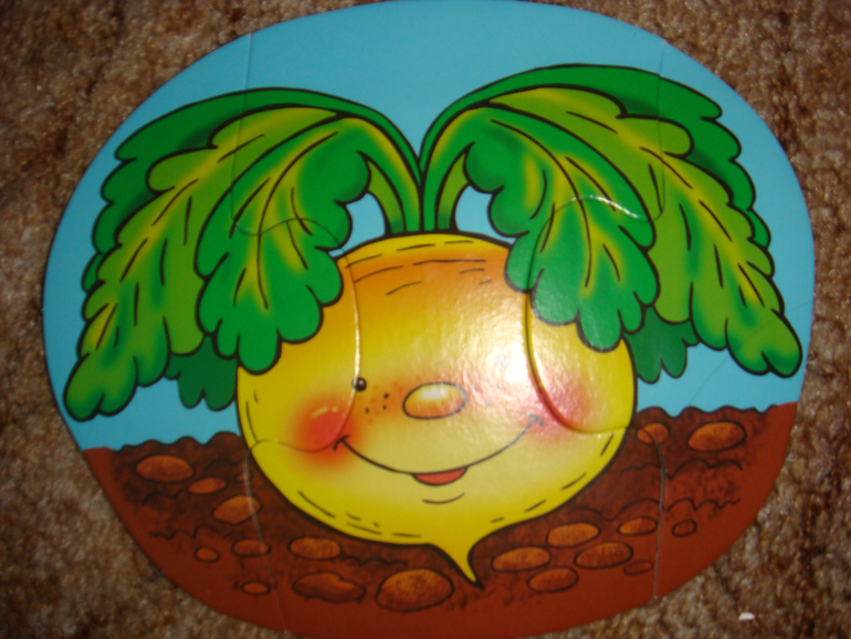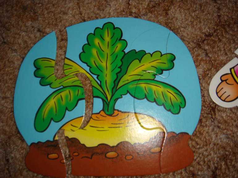 Репки две. Одна в земле, дед посадил, а друга вытянута из земли. Но я одну пока убираю, иначе ребенок путается.![]()