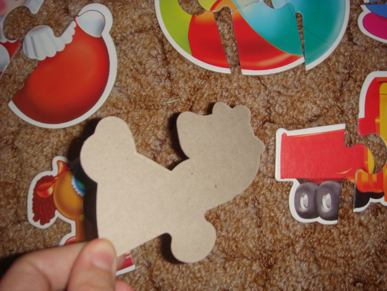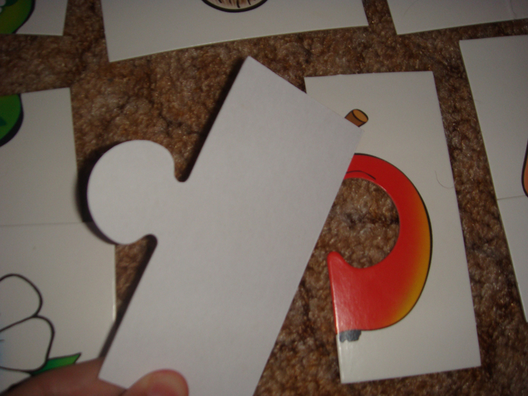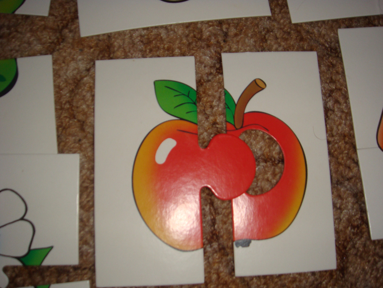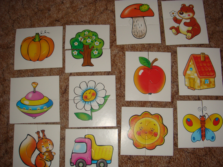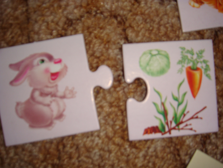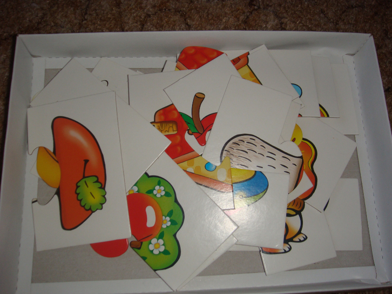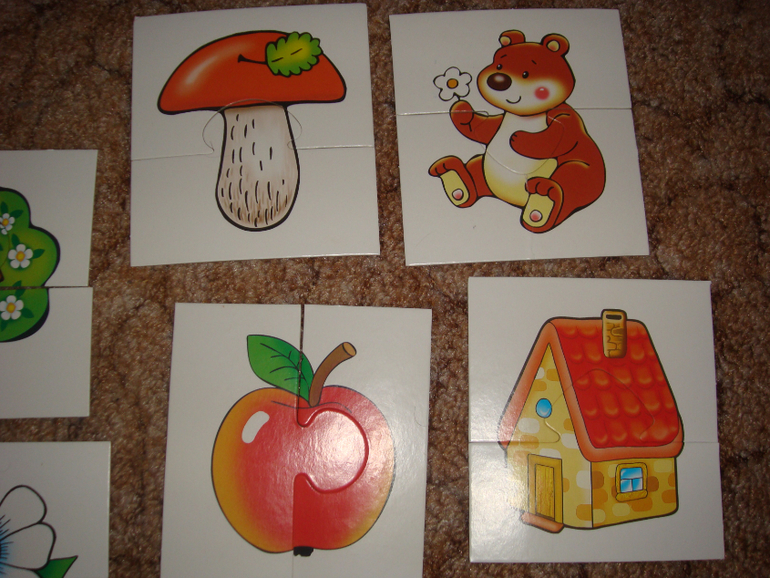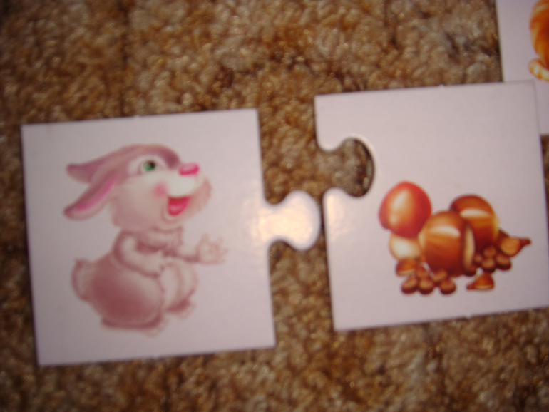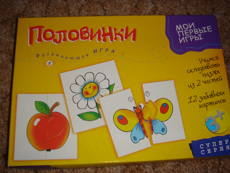 А вот эта игра подходит даже годовасикам. Малышу надо собрать картинку из двух половинок. Картинки понятны маленькому ребенку. Картон плотный. Пазловый замочек у всех картинок разный, поэтому неправильно собрать не получится. Размер готовой картинки 12 см. на 11 см.![]()