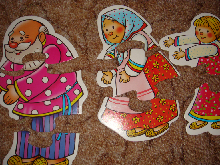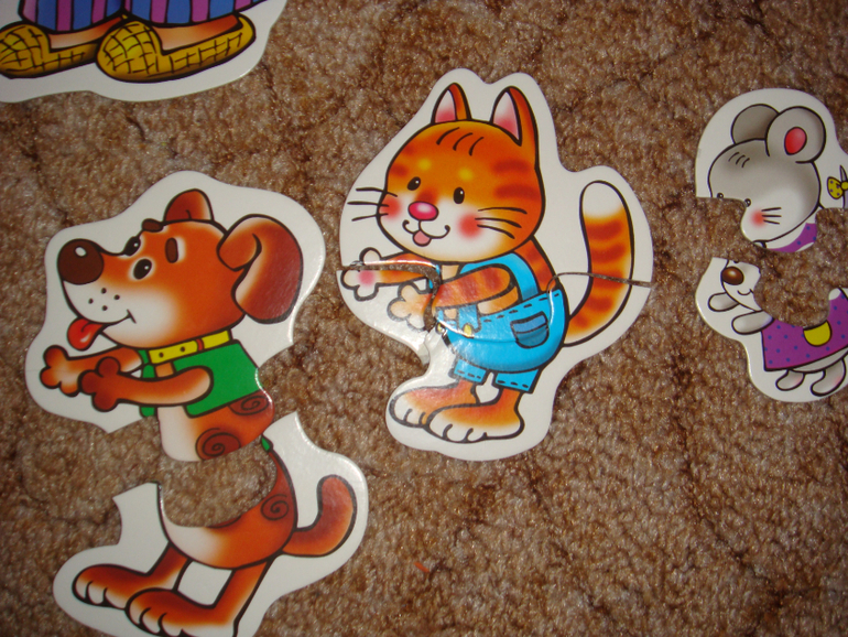 Пазлы состоят из 2-3 частей. Картон также очень плотный и белый. Картинки приятные. Размер деда 20 см. на 15см. а мышки - 8см. на 6см.