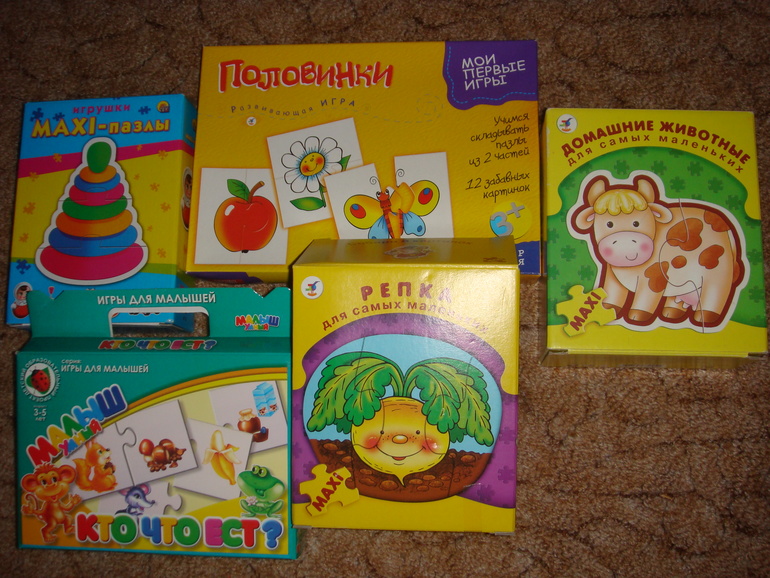 Игры на любой вкус!!!Мой ребенок в последнее время очень увлекся всякого рода пазлами. И главное, что сейчас получается правильно подбирать и соединять замочки. Для малышей нужны пазлы крупные, прочные и состоящие из 2-3 частей. Вот, что на данный момент мы имеем.