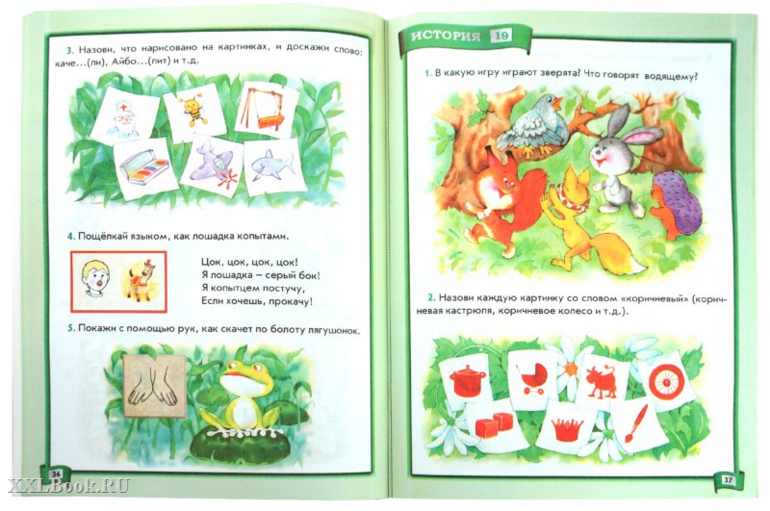 Второе задание - как правило ряд картинок с изображениями предметов, которые малыш должен назвать. Кроме этого, каждая история включает 1-2 задания на "разминку" для пальчиков и язычка, проиллюстрированных милыми стихотворениями или маленькими историями.
