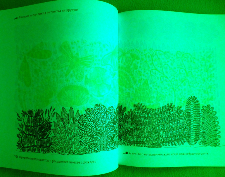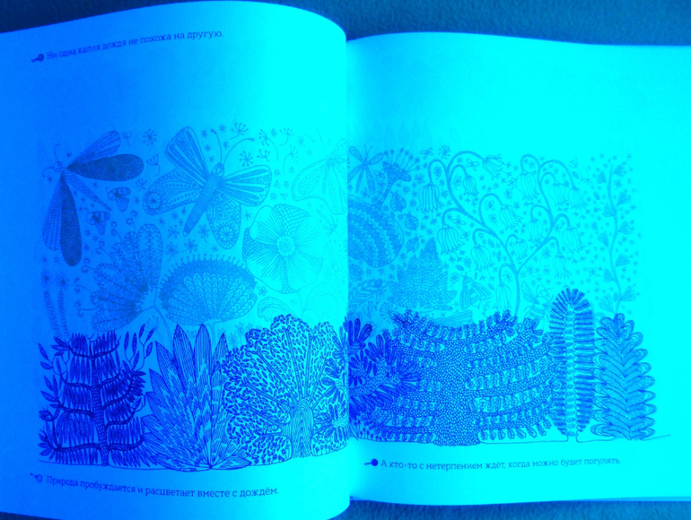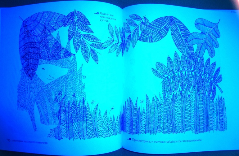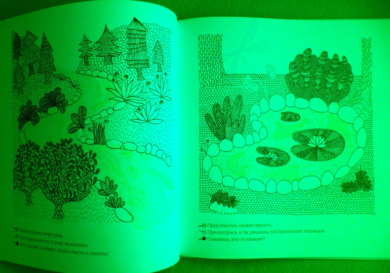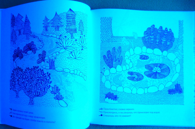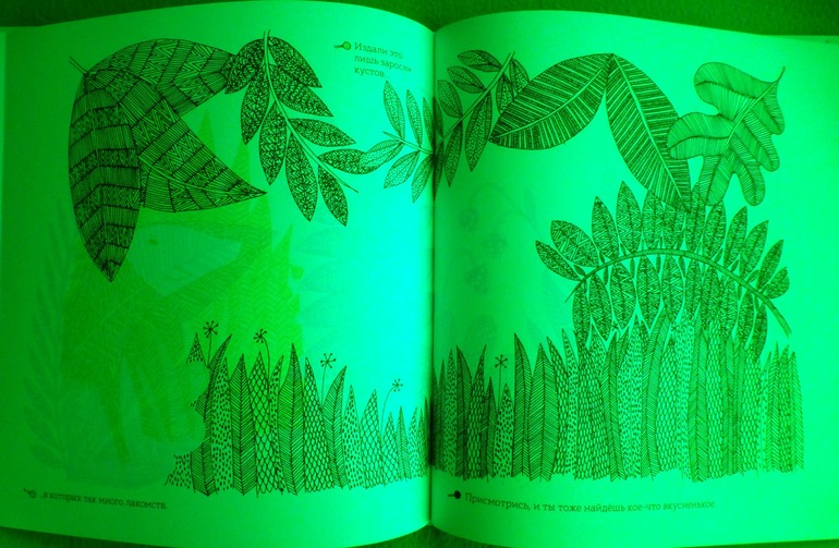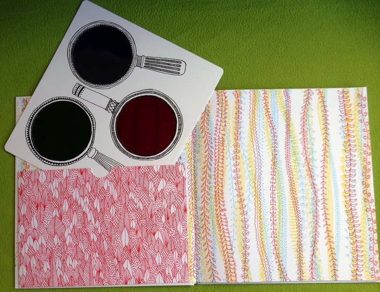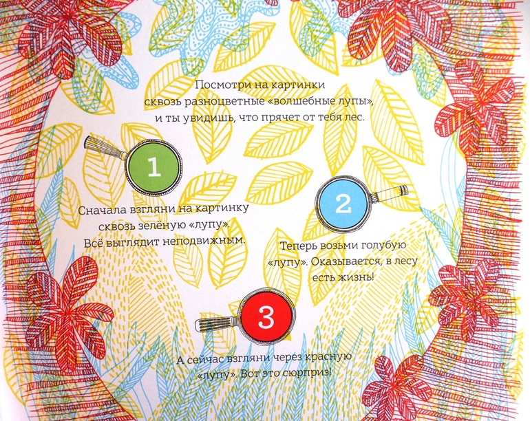 Секрет кроется в трех лупах. На форзаце книги прикреплен карман, где хранится лист с тремя лупами с пластиковыми цветовыми фильтрами - красным, синим и зеленым. Их можно вырезать. Рассматривая книгу через цветовые фильтры, открывается живой мир, скрытый от наших глаз.