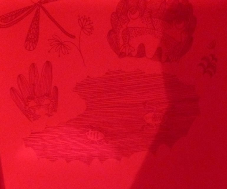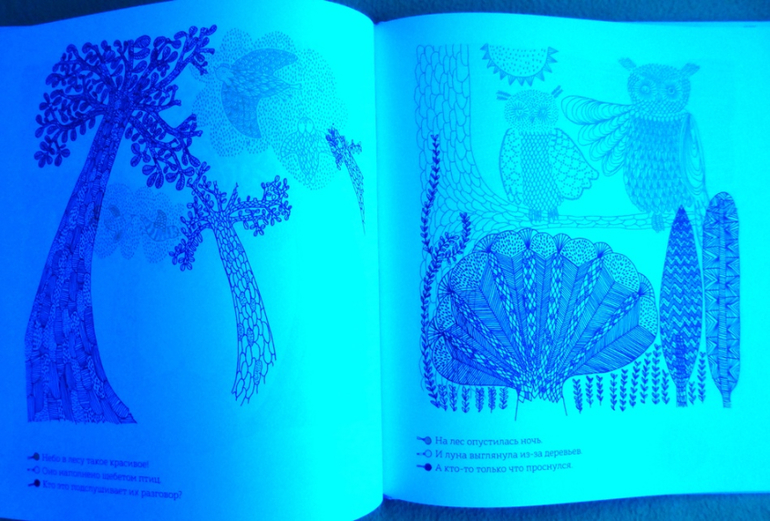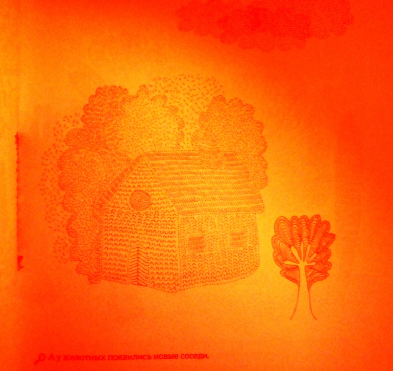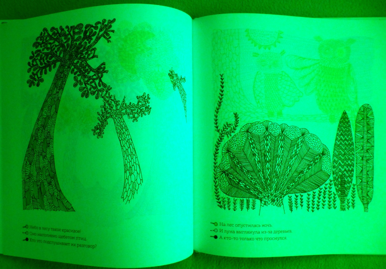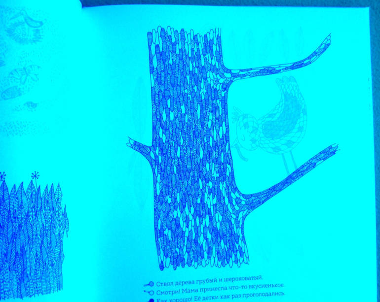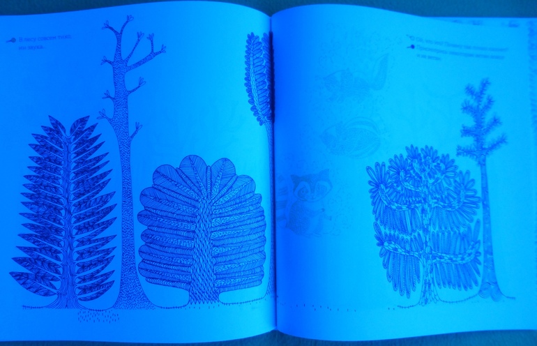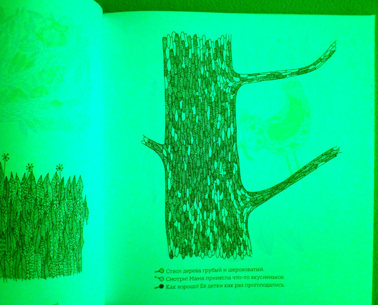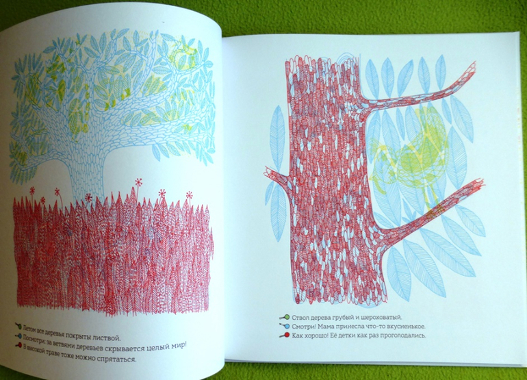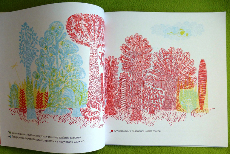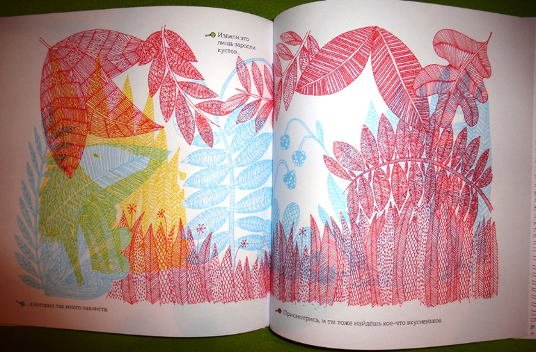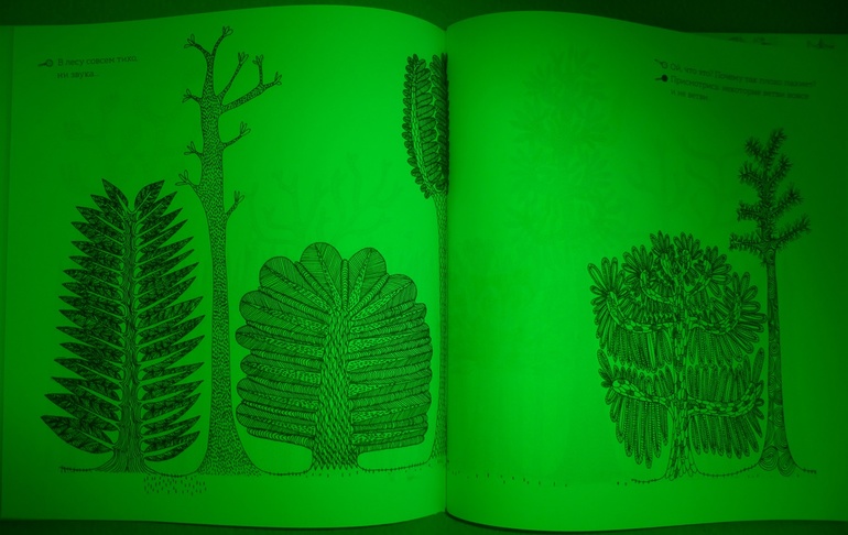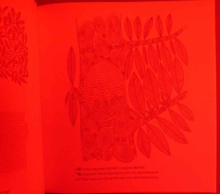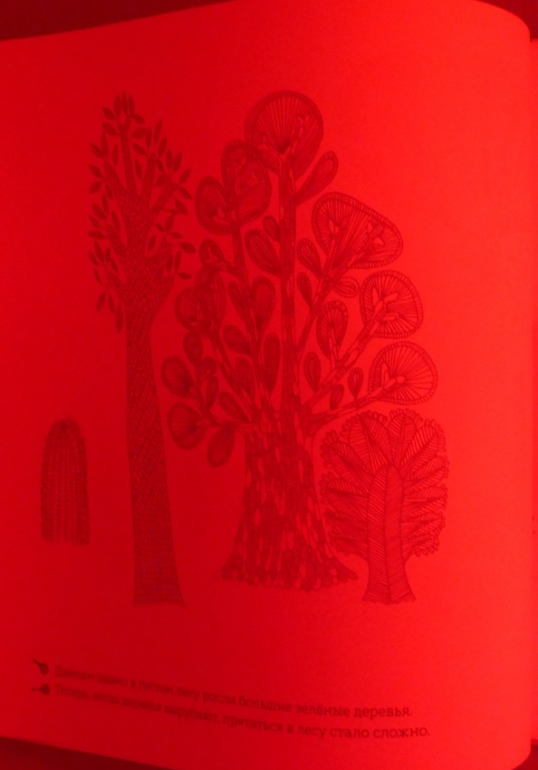 Рассматривая странички, мы окажемся, как в настоящем лесу, за листвой и ветвями, в дуплах деревьев и норах, за облаками и в воде, укрылись животные, птицы, рыбы, насекомые. Контурные иллюстрации в книге напечатаны тремя красками - желтой, голубой и красной. Разноцветные линии накладываются друг на друга и образуют сложный узор, в котором можно узнать только общие очертания леса.