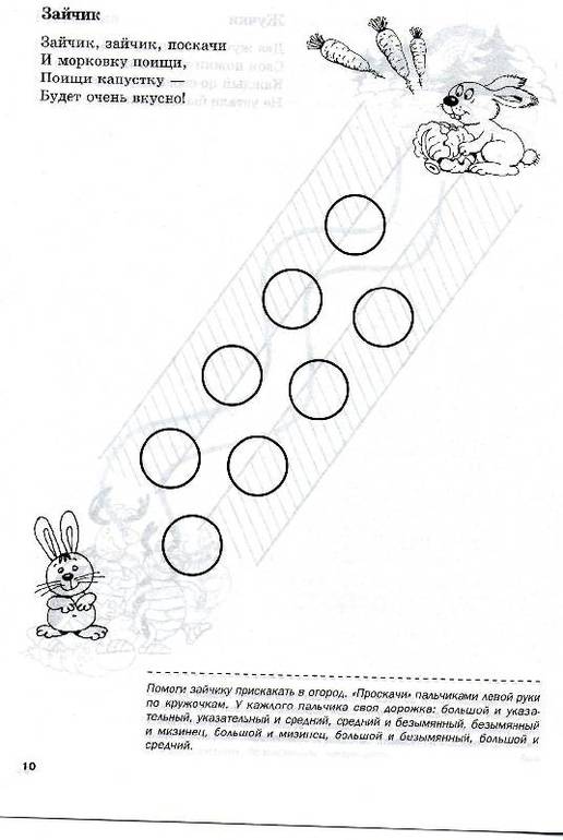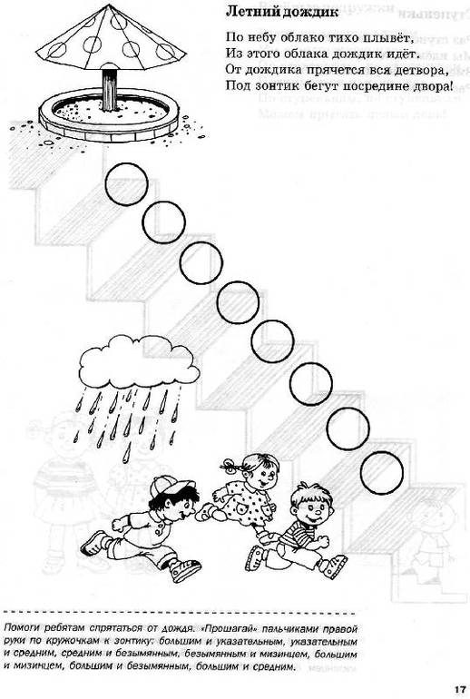 В книге, на каждой странице сначала идет стишок, а далее описываются варианты работы с пальчиками ( для правой руки - четные страницы, для левой - нечетные.
