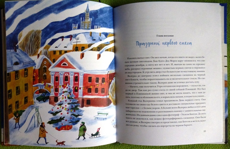 «Каждый год Валеркина семья праздновала День первого снега. Они готовили на ужин еду белого цвета и доставали специальные праздничные тарелки - с белым узором. А больше всего Валерка любил в этот день забираться на подоконник и разглядывать книжку с удивительными снежинками. Их давным-давно снял один фотограф Уилсон Бентли. До него никто не додумался, как можно сфотографировать снежинки. Они были все разные, и Валерка смотрел и представлял, как…..»