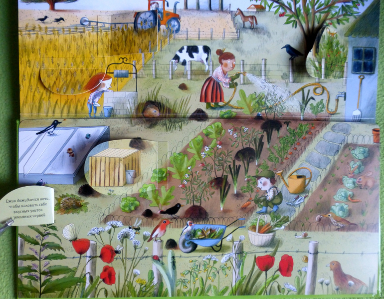 В огороде мы увидим, как трудятся дождевые черви и узнаем, за счет чего земля становится плодородной. Рассматривая страничку, узнаем, как крольчиха устроила для своего потомства уютное гнездышко и, как в своей норке устроился запасливый крот.