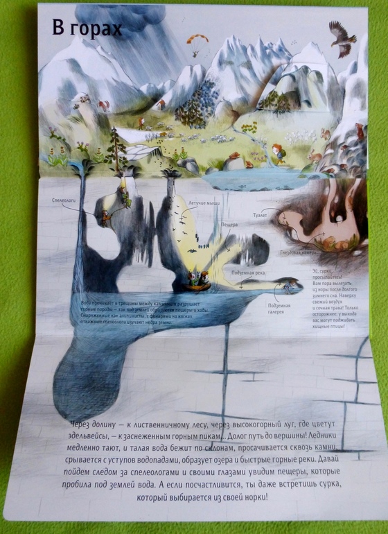 На страницах книги можно прогуляться к заснеженным горным пикам, увидеть, как тают ледники и как талая вода бежит по склонам, просачиваясь сквозь камни образуя озера и быстрые горные реки. А если пойти следом за спелеологами, то можно увидеть пещеры, которые пробила под землей вода.