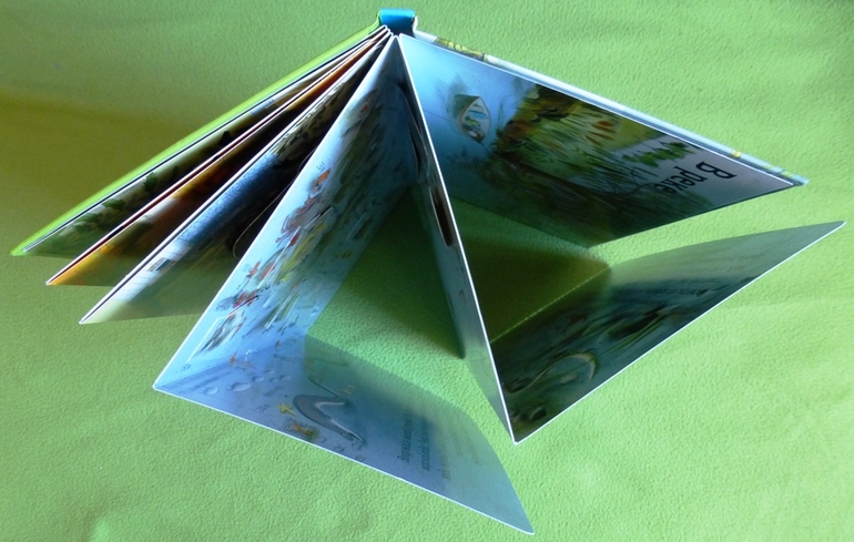 Книга вытянутого формата 32,5 х 16,5 см, обложка из очень прочного, толстого картона с ламинированным покрытием, страницы из гнущегося картона. Все сделано качественно.