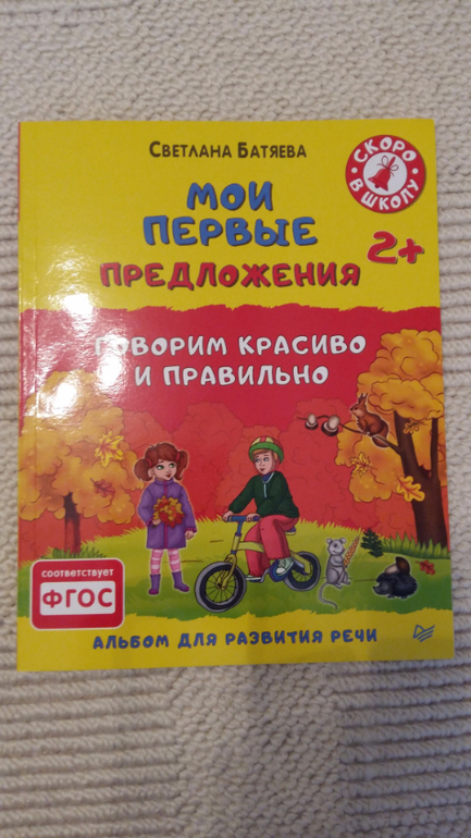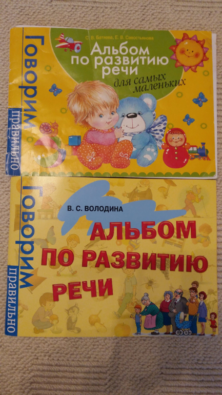 Решила поделиться нашими пособиями.Первый (наверное,есть у всех)Это альбом по развитию речи для самых маленьких С.В.Батяева .Составлен очень грамотно.От простого к сложному.Второй альбом В.С. Володина для деток,которые разговаривают.Альбом учит правильно говорить.(множественное число,предлоги,склонять по падежам)