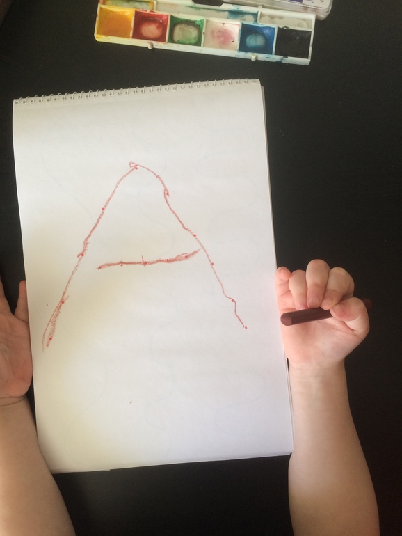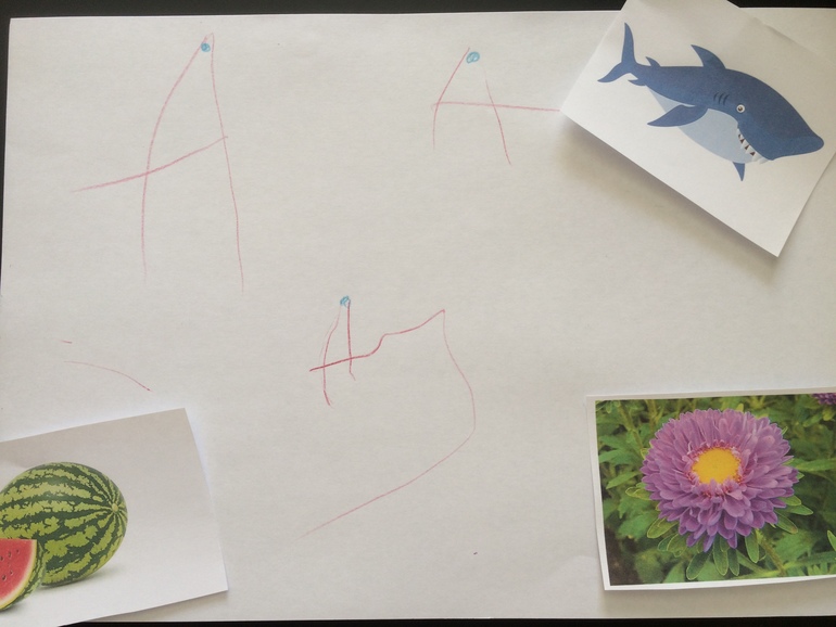 Мы тоже примерно так учим. Еще ищем буквы в словах, слогах. Лепим из пластилина. Тренируемся писать. Тоже рисует букву а. позже скину печатные файлы или ссылки. А вот игры на улице понравились. Позже воспользуемся