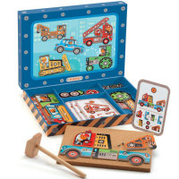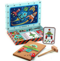Такие наборы подойдут детям от 3 лет, достаточно безопасные. Однако если ваш ребенок любит пробовать на зуб мелкие предметы, то с покупкой лучше повременить. В наборы входят: доска пробковая, детали конструктора, молоточек и гвоздики. С помощью молоточка и гвоздиков детали мозаики прибиваются к доске.