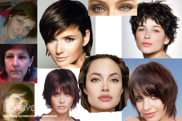 Цвет волос можно оставить свой, можно на пол тона-тон поярче, выбирать лучше пепельные каштановые оттенки, не русые. Светлее красить не нужно. И, однозначно - короткая стрижка с челкой, длиной не ниже уголков губ. Она внесет в Ваш образ свежесть, яркость и динамичность.) И не будет доставлять особых хлопот с укладкой. Единственное, ее нужно регулярно обновлять, чтобы прическа всегда выглядела ухоженной даже при укладке "голова с подушки".)) Вам не подойдут четкие статичные линии (например, каре), как и плавные локоны, волосы должны быть разной длины (градуировки). Примерные стрижки ниже. В макияже днем лучше использовать нейтральную палитру: коричнево-бежево-розовую и серо-зеленую. Не нужны яркие цветные тени и помада, главное добиться ровного ухоженного цвета лица с помощью тональных средств и корректора, слегка подчеркнуть скулы румянами, блеск (или помада натурального оттенка) для губ, для глаз - темно-коричневая тушь и карандаш вместо черного и достаточно светлые тени. Бежево-розовые и коричневые тона будут подчеркивать цвет глаз. В целом, макияж может выглядеть как у Анджелины Джоли на коллаже.