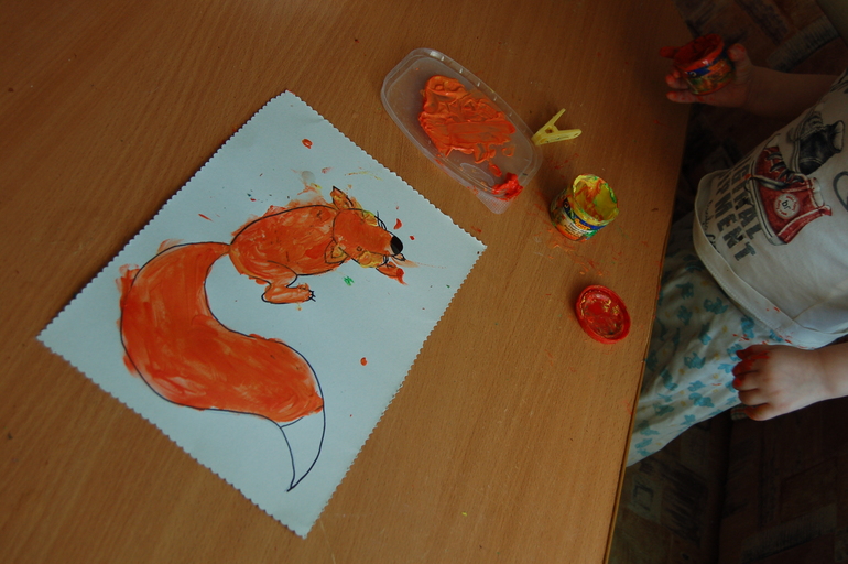 Далее,чтобы не откладывать, решили закрепить,так сказать, черты лисьей внешности.Для этого я нарисовала контур зверя ( в примитивной,конечно,манере:),а Тёма должен был высокохудожественно разукрасить.