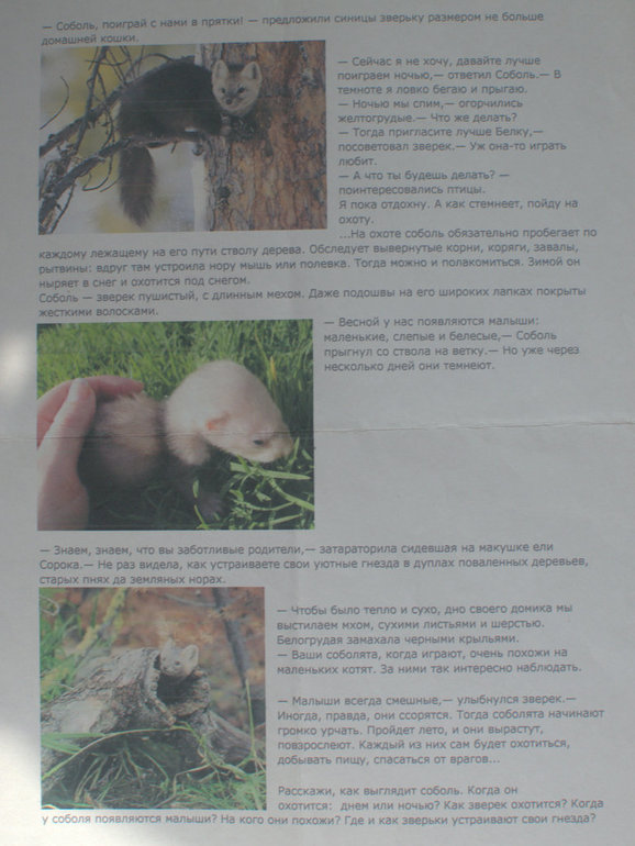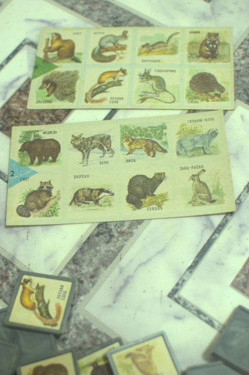 Мы узнали, что в лесах здесь водится много зверья: ондатра, белка, заяц; хищники - выдра, ласка, горностай, колонок, лиса, росомаха, рысь, медведь, лось. Из птиц - рябчик, тетерев, глухарь, дятел, сойка и другие. Поиграли в лото
