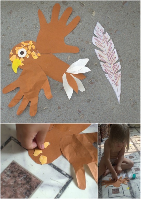 Перышки вырезали так - я на своем показала Алисе идею, вторую сторону резали вместе. Но свои перья она почикала в клочья (это у нас в последнее время забава такая - все резать на мелкие кусочки!)