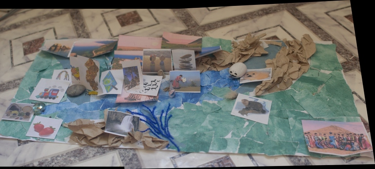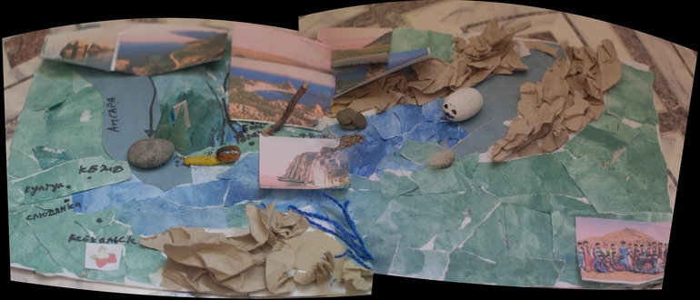 На этом осмотр достопримечательностей Байкала закончился. А вот так выглядел наш макет. Сначала клеили фото, на для них совсем мало места, поэтому с середины где-то перестали. К сожалению, красивой панорамы не получилось у меня, но понять можно. Тут у нас и Шаман-камень, и золото, и ходульное дерево, и юрта, и белек и т.д.