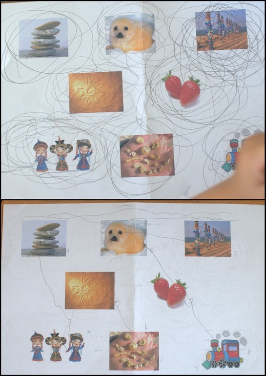 Потом рисовали проводилки-последовательности. Алиса поначалу решила, что у нее своя дискотека и обвела все картинки:) Но потом все стерли и сделали по правилам:)