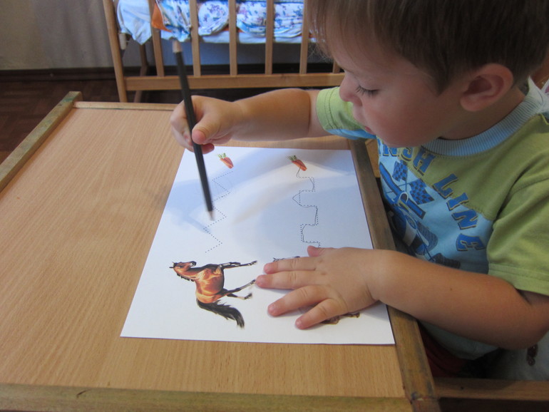 Провели лошадок к морковкам! Одну линию я помогала Максиму проводить, а вторую он сам рисовал))