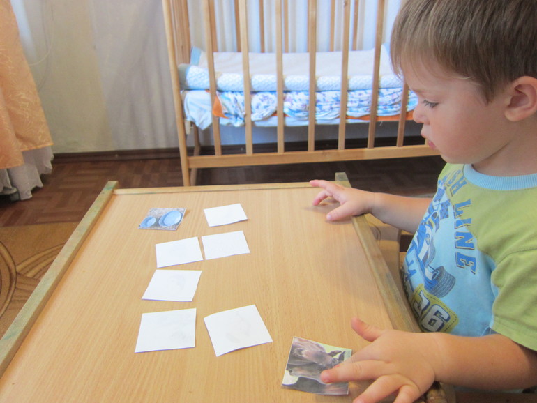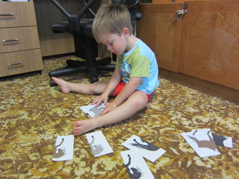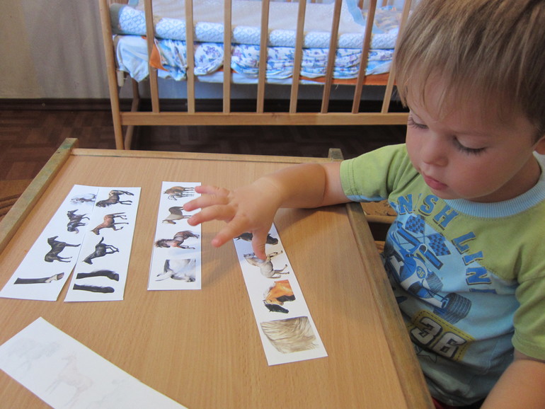 Лист с игрой "найди, чья часть слева" я разрезала на полоски, чтоб Максим меньше путался! В итоге из 5 полос только 1 ошибка!