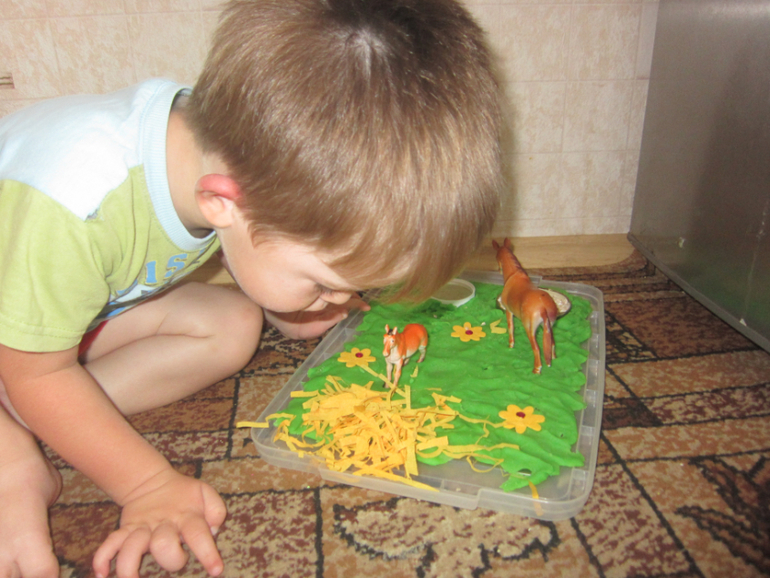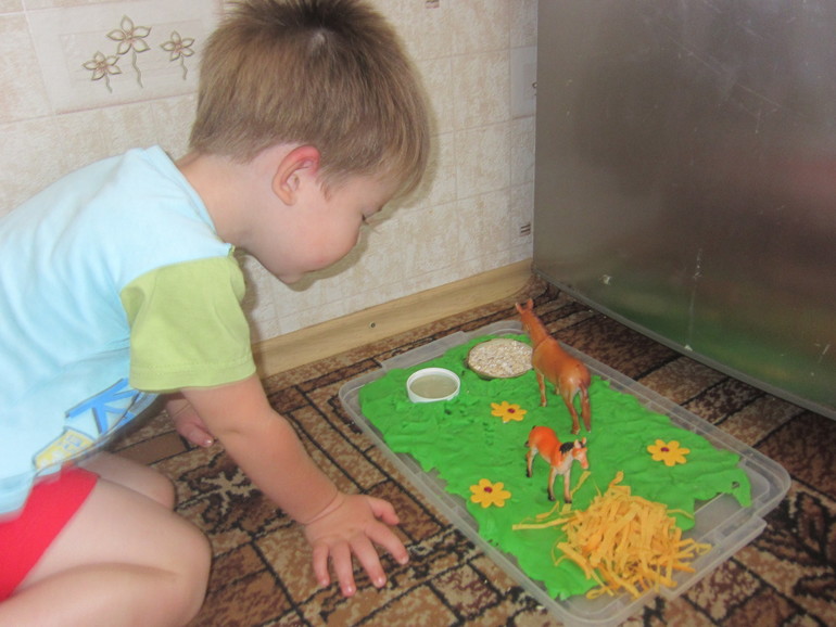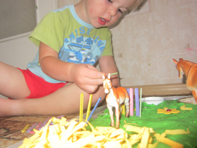 После дневного сна Максима ждала сенсорная коробочка (если это можно так назвать) с 2 лошадками, кормушками, сеном и лугом из зеленого соленого теста! Максиму понравилось! Пока он играл, я рассказала, что лошадки кушают!