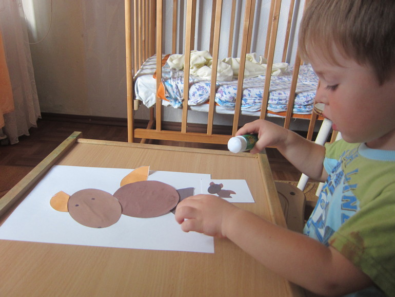 Отправили нашу заготовку сохнуть на балкон, отмыли себя и стол и сделали аппликацию из геометрических фигур! Наш зверь почему-то не очень был похож на лошадь!))