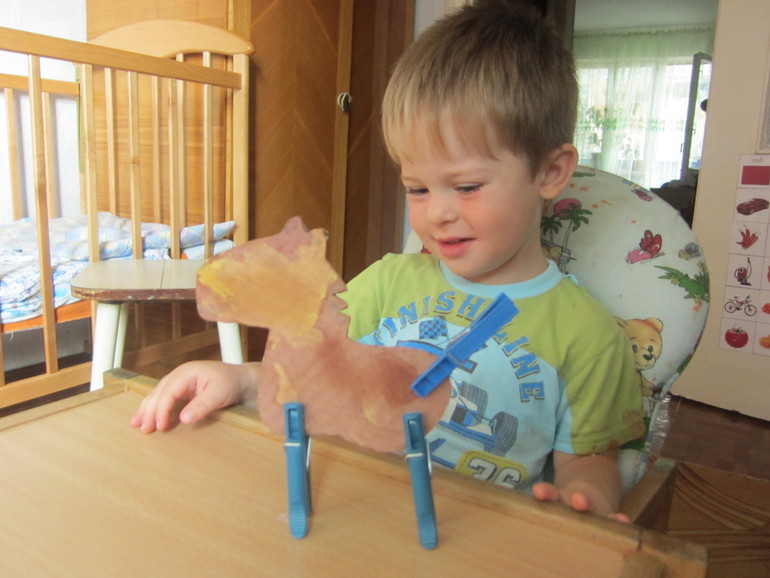 И в завершение играли с прищепками! Максиму конь очень понравился, долго бегал с ним по квартире, а потом поселил на нашем лугу из теста)))