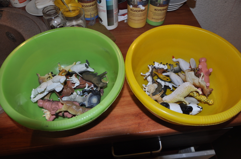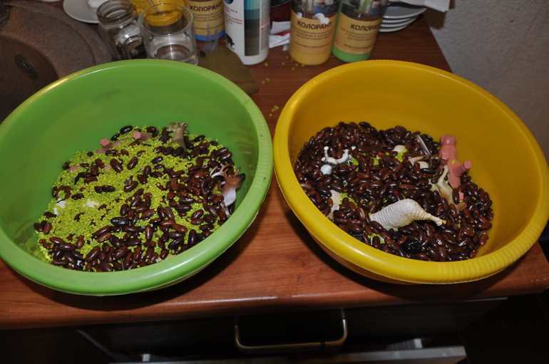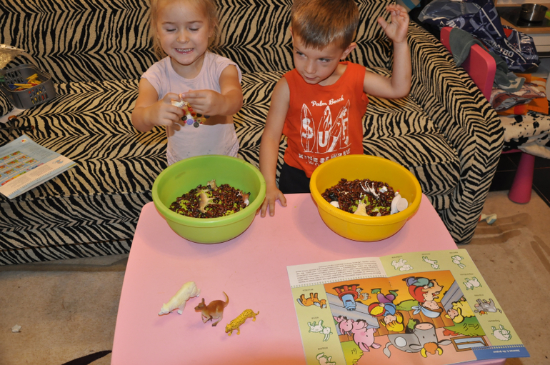 В понедельник утром детей ждали сенсорные коробки, но не простые,а на логику. В две миски я положила разных животных, большая часть которых была домашними животными и засыпала зелёным рисом и фасолью.