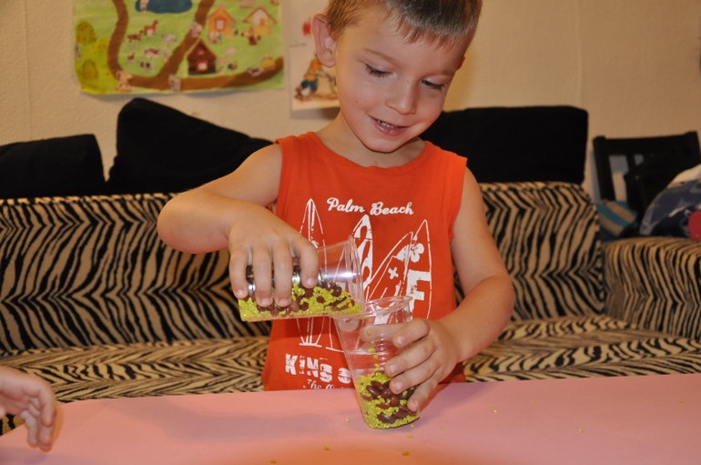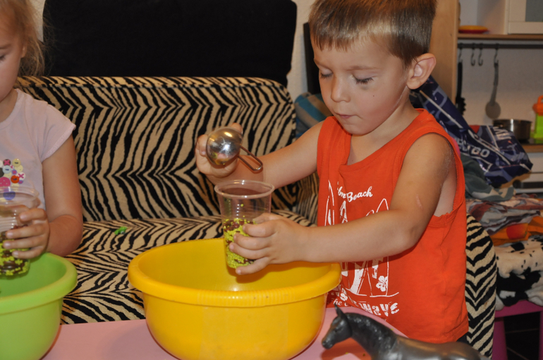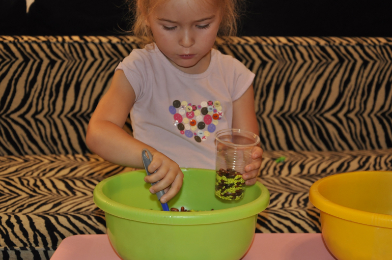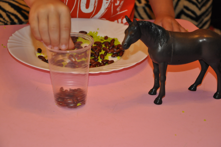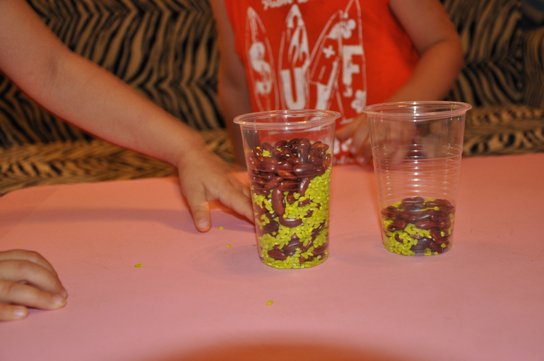 Для этого достала два стаканчика и мы принялись насыпать еду))) Играли в больше - меньше - поровну.