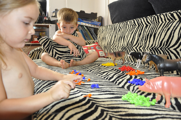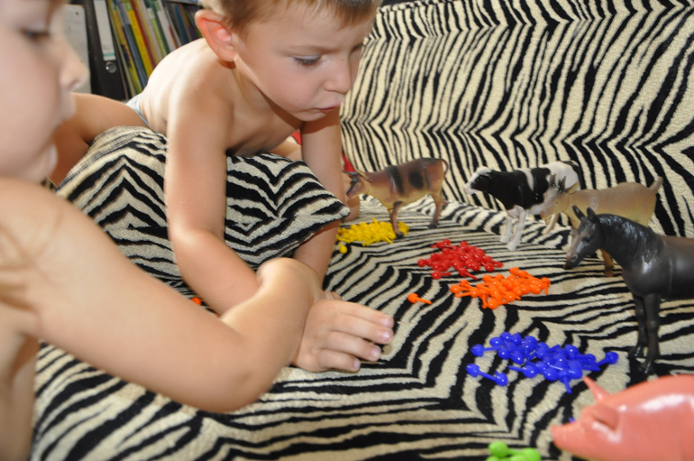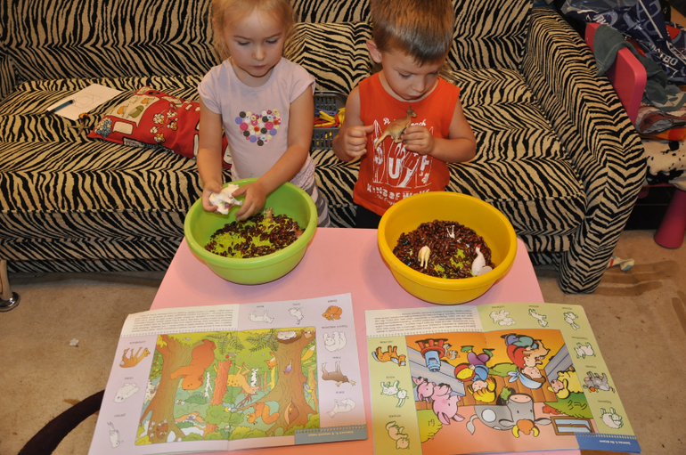 Наша неделька, которую проводит Светлана началась внезапно в воскресенье))) утром, перед завтраком. Пока я варила кашу Тёмыч решил поиграть с мозайкой, а я ему сразу задание на сортировку))) Без Вики такие игры не проходят)) Вначале "поругались", потом каждый ждал когда один из них накормит "своих" животных, но и потом кормили вместе)))